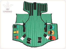 O colete possui também 2 correias de fixação posicionadas na parte posterior para fixação do membros inferiores da vítima.Todo o equipamento vem acondicionado em sacola de nylon p/facilitar seu transporte e conservação. Possui resistencia para imobilizar e transportar vitimas de até 165 KG.